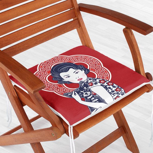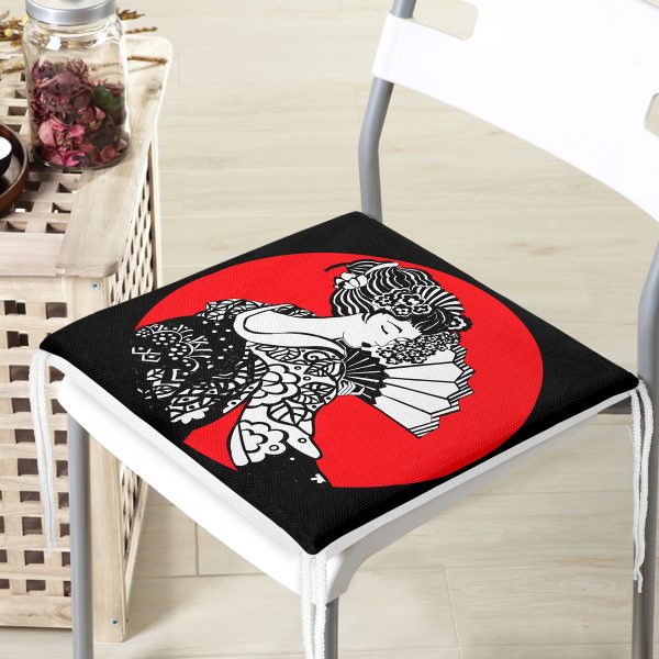 Kırmızı Yelpazeli Şaman Japon Kadın Dijital Baskılı Fermuarlı Sandalye Minderi