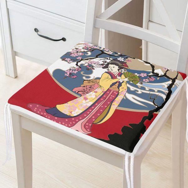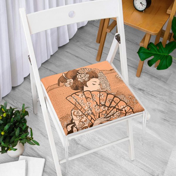 Yelpazeli Japon Kadın Motifli Dekoratif Fermuarlı Sandalye Minderi
