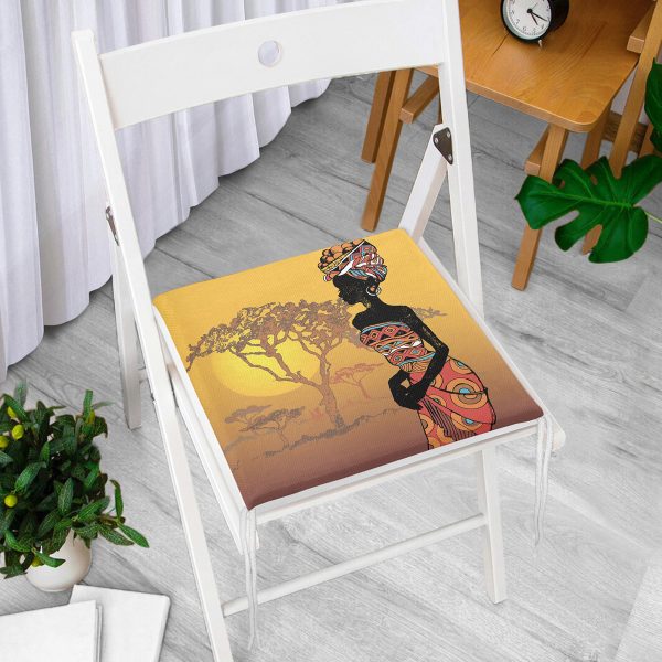 Güneşin Batışındaki Ağaç Zeminli Afrika Kadın Motifli Fermuarlı Sandalye Minderi