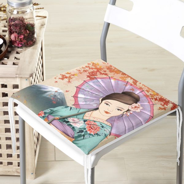 Şemsiyeli Japon Kız Motifli Dekoratif Fermuarlı Sandalye Minderi