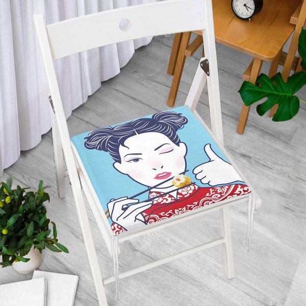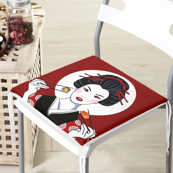 Suşi Yiyen Japon Kız Motifli Modern Fermuarlı Sandalye Minderi