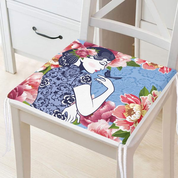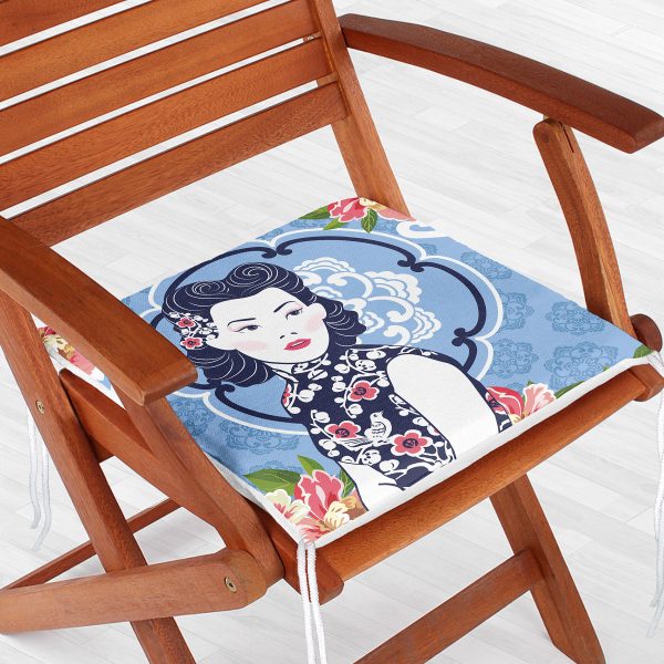 Beyaz ve Mavi Zeminli Çiçekli Japon Kadın Desenli Modern Fermuarlı Sandalye Minderi