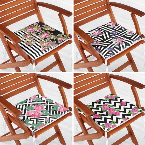 4’lü Siyah Çizgili Zemin Çiçek Motifli Fermuarlı Sandalye Minderi Seti