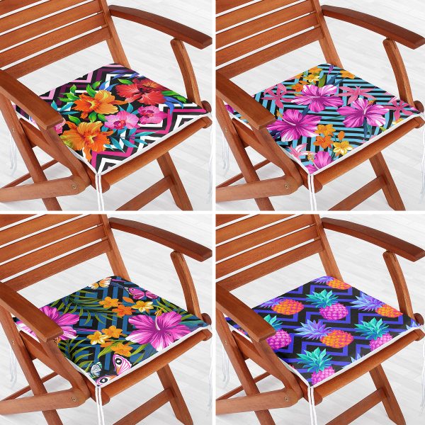4’lü Geometrik Zeminli Renkli Tropik Çiçekler Fermuarlı Sandalye Minderi Seti