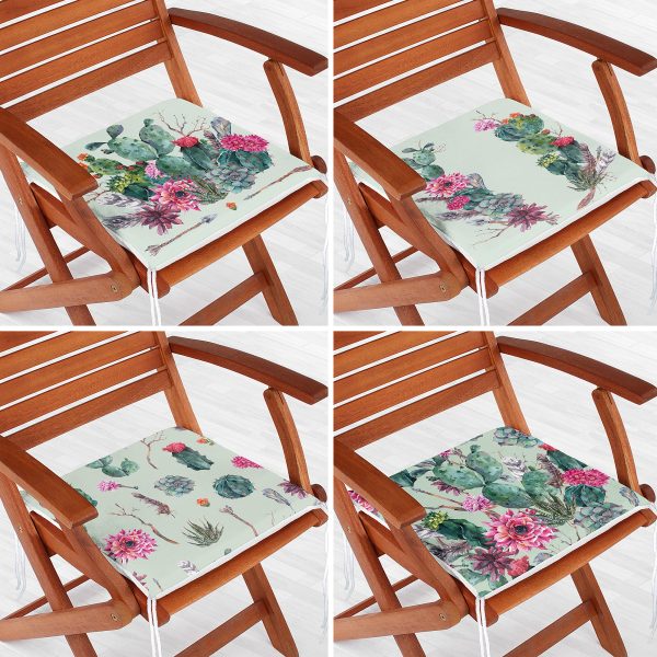4’lü Renkli Zemin Üzerinde Kaktüs Desenli Modern Fermuarlı Sandalye Minderi Seti