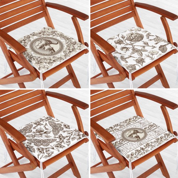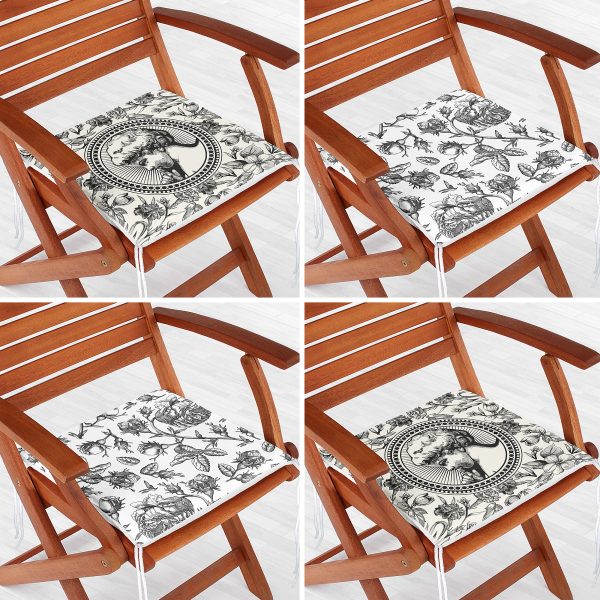 4’lü Beyaz Zemin Üzeinde Botanik Portre Çizimli Özel Tasarım Dijital Basklı Modern Fermuarlı Sandalye Minderi Seti