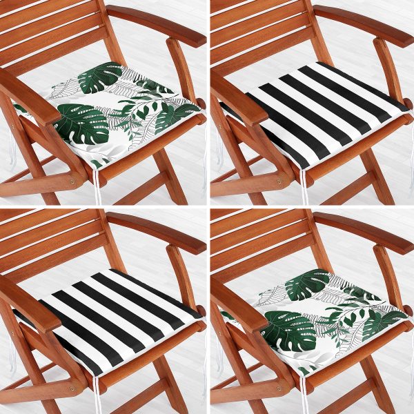 4’lü Siyah Beyaz Çizgili Tropik Yaprak Motifli Fermuarlı Sandalye Minderi Seti