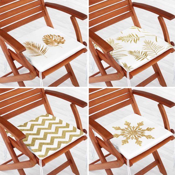 4’lü Altın Varaklı Yaprak ve Zigzag Motifli Fermuarlı Sandalye Minderi Seti