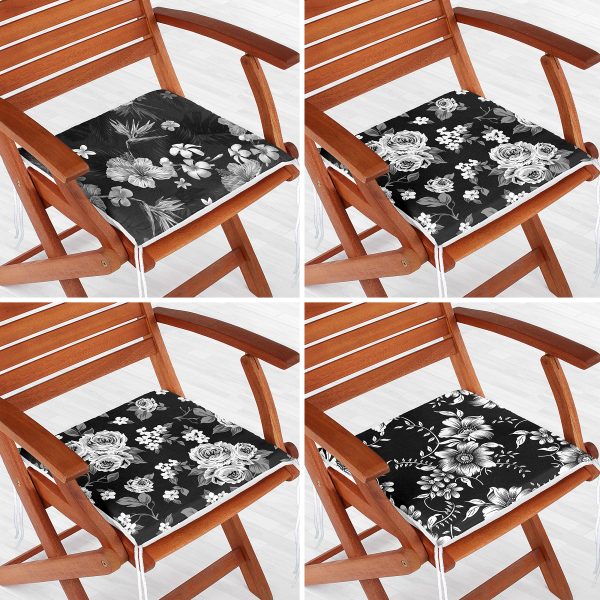 4’lü Siyah Zemin Üzerinde Çiçek Desenli Modern Fermuarlı Sandalye Minderi Seti