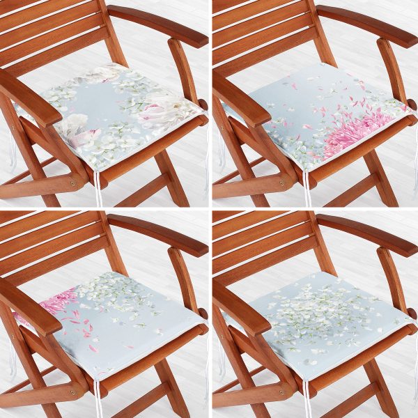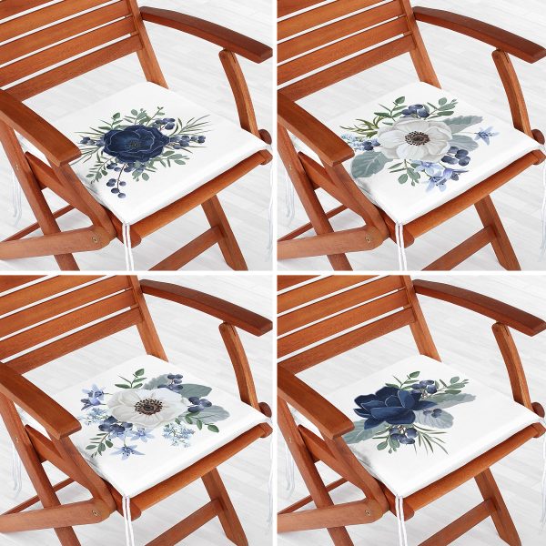 4’lü Mavi Beyaz Gül Tasarımlı Dijital Baskılı Modern Fermuarlı Sandalye Minderi Seti