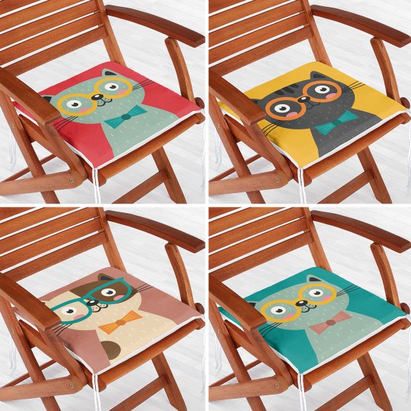 4’lü Renkli Sevimli Kedicik Baskılı Fermuarlı Sandalye Minderi Seti