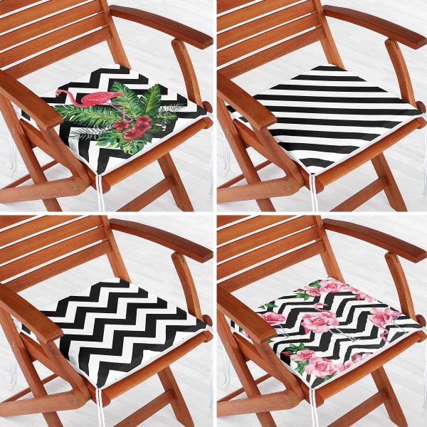 4’lü Flamingo ve Siyah Beyaz Geometrik Desenli Fermuarlı Sandalye Minderi Seti