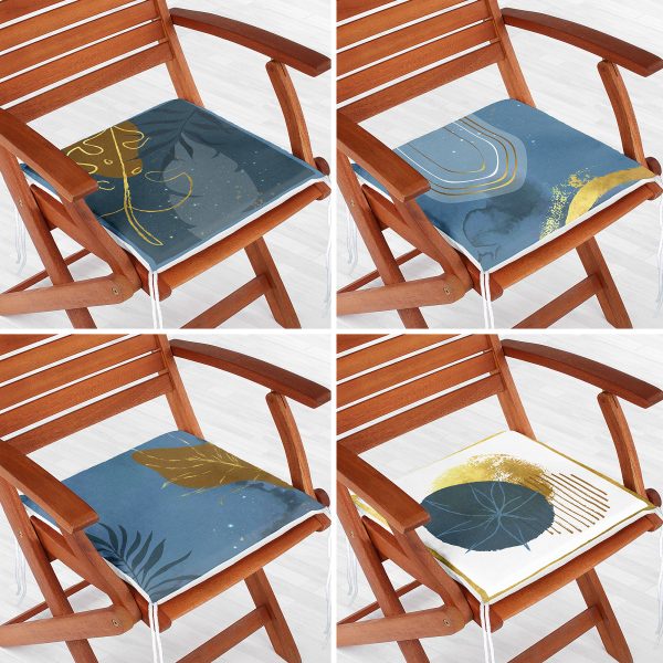 4’lü Renkli Zemin Üzerinde Gold Detaylı Yaprak Desenli Modern Fermuarlı Sandalye Minderi Seti