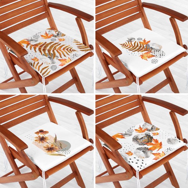 4’lü Beyaz Zemin Üzerinde Kurumuş Yaprak Ve Çiçek Tasarımlı Modern Dijital Baskılı Fermuarlı Sandalye Minderi Seti