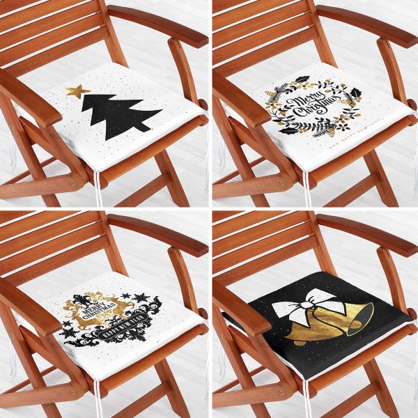 4’lü Siyah Beyaz Gold Detaylı Mery Christmas Temalı Dijital Baskılı Modern Fermuarlı Sandalye Minderi Seti