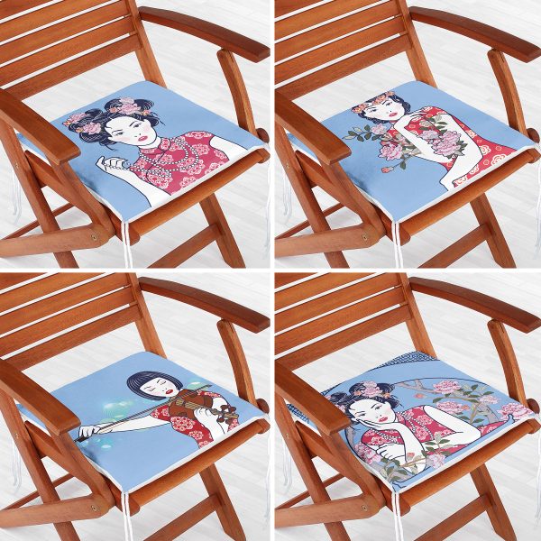 4’lü Mavi Zemin Üzerimde Japon Kız Motifli Fermuarlı Sandalye Minderi Seti