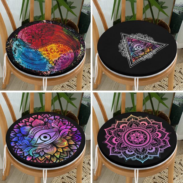 4’lü Siyah Zeminde Rengarenk Mandala Motifli Dijital Baskılı Yuvarlak Fermuarlı Sandalye Minderi Seti
