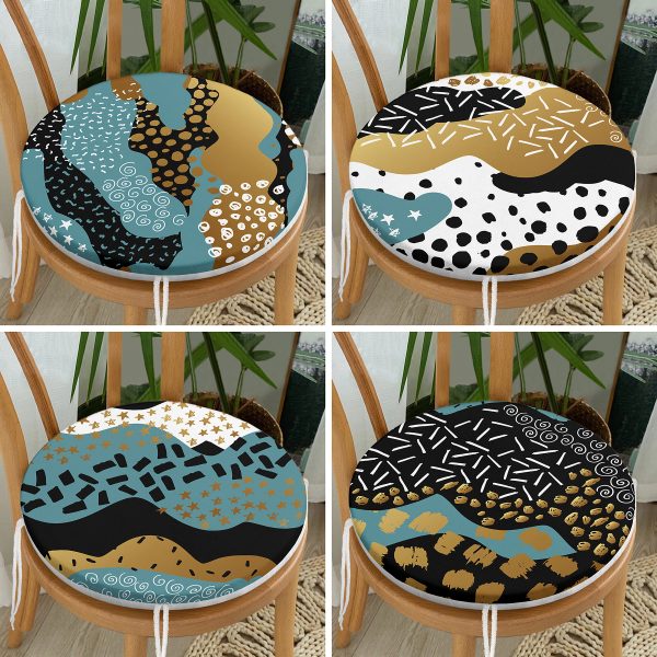 4’lü Renkli Zemin Üzerinde Gold Detaylı Soyut Çizimli Modern Yuvarlak Fermuarlı Sandalye Minderi Seti