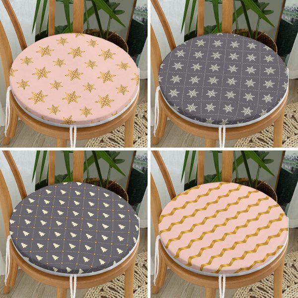 4’lü Renkli Zemin Üzerinde Gold Detaylı Yılbaşı Desenli Modern Yuvarlak Fermuarlı Sandalye Minderi Seti