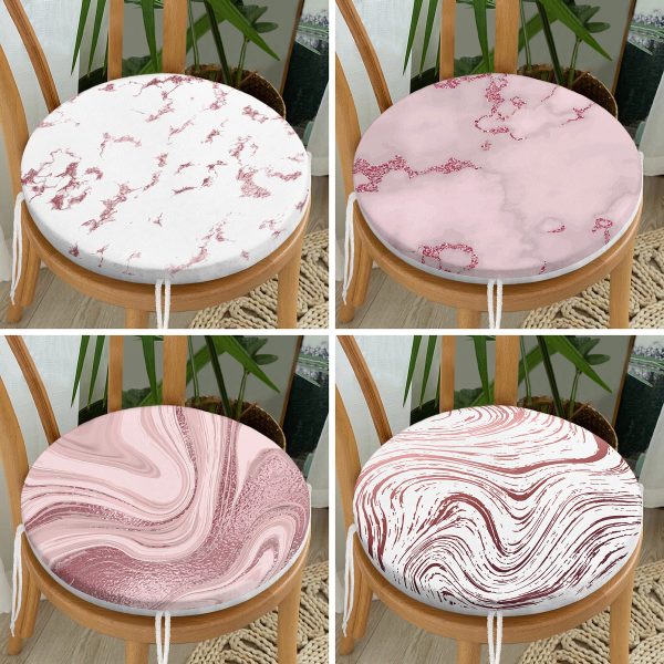 4’lü Renkli Zemin Üzerinde Gold Detaylı Mermer Desenli Modern Yuvarlak Fermuarlı Sandalye Minderi Seti