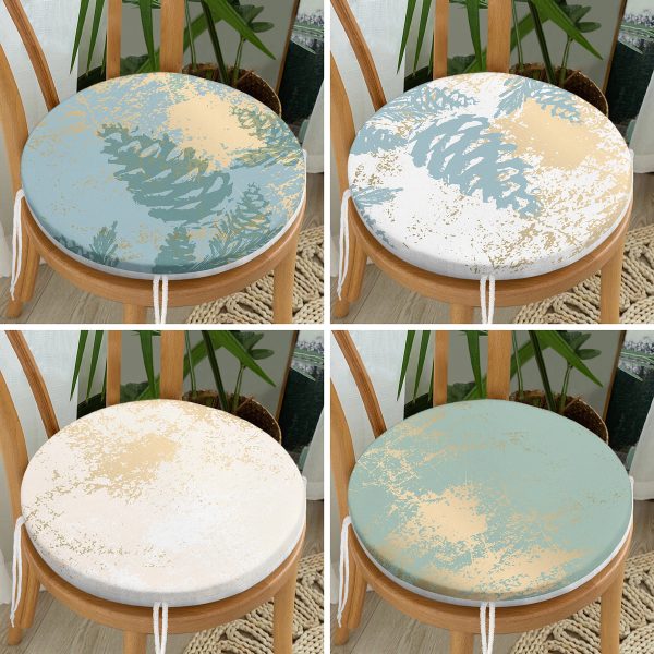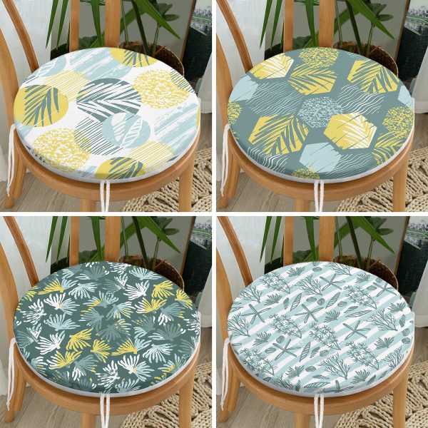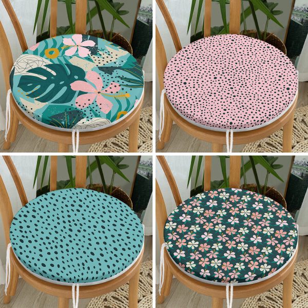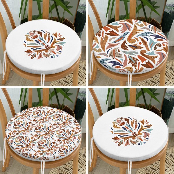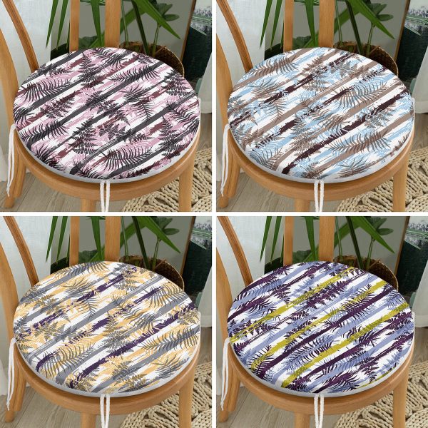 4’lü Renkli Zemin Üzerinde Yaprak Desenli Modern Yuvarlak Fermuarlı Sandalye Minderi Seti