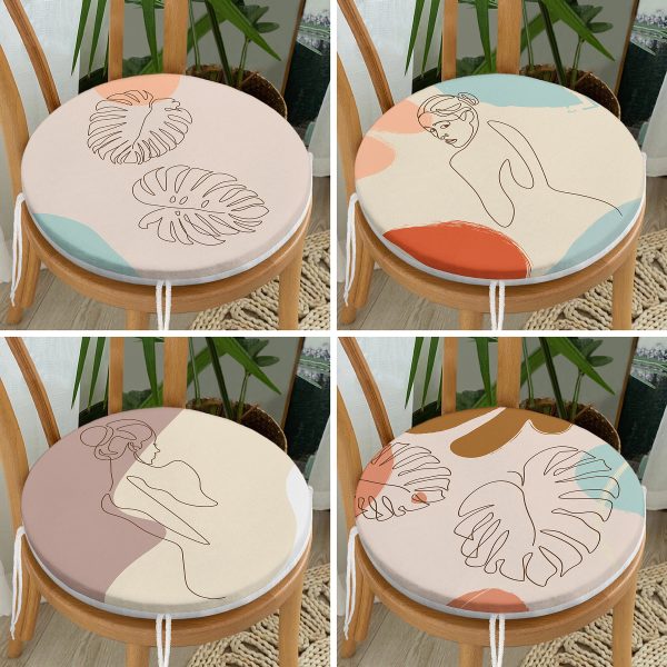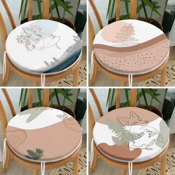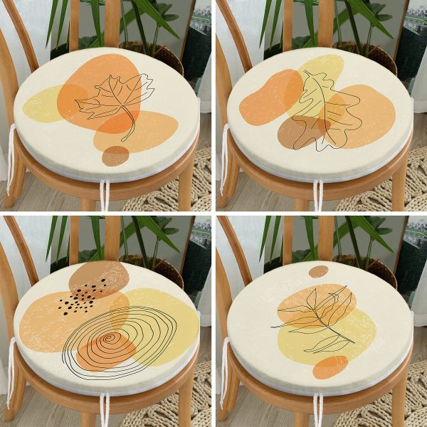 4’lü Renkli Zemin Üzerinde Onedraw Çizimli Yaprak Desenli Modern Yuvarlak Fermuarlı Sandalye Minderi Seti