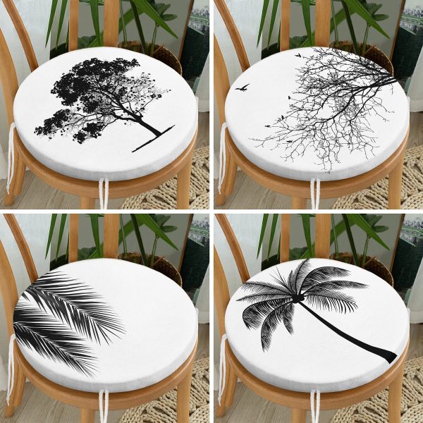 4’lü Beyaz Zeminde Ağaç Temalı Dijital Baskılı Modern Yuvarlak Fermuarlı Sandalye Minderi Seti