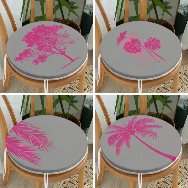 4’lü Gri Zeminde Fuşya Ağaç Motifli Dekoratif Dijital Baskılı Yuvarlak Fermuarlı Sandalye Minderi Seti