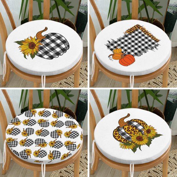 4’lü Siyah Beyaz Ekoseli Kabak Motifli Özel Tasarım Kombin Yuvarlak Fermuarlı Sandalye Minderi Seti