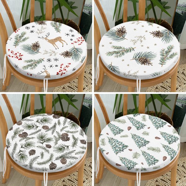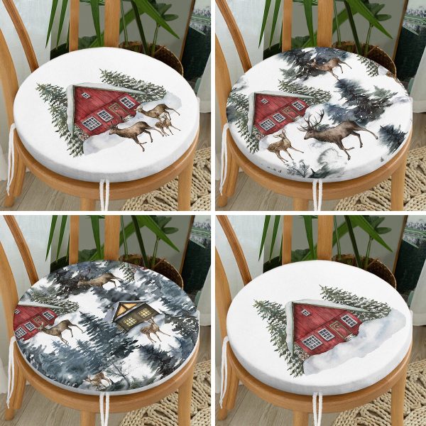 4’lü Bağ Evi Özel Tasarım Kış Temalı Dijital Baskılı Modern Yuvarlak Fermuarlı Sandalye Minderi Seti