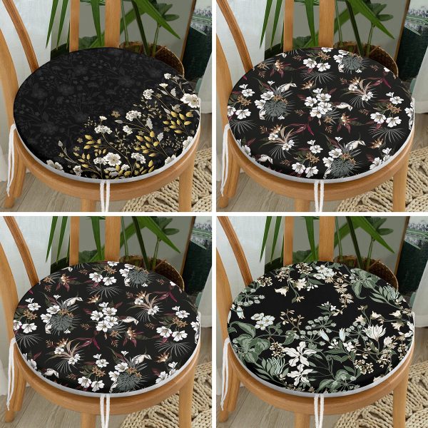 4’lü Siyah Zemin Üzerinde Çiçek Desenli Modern Yuvarlak Fermuarlı Sandalye Minderi Seti