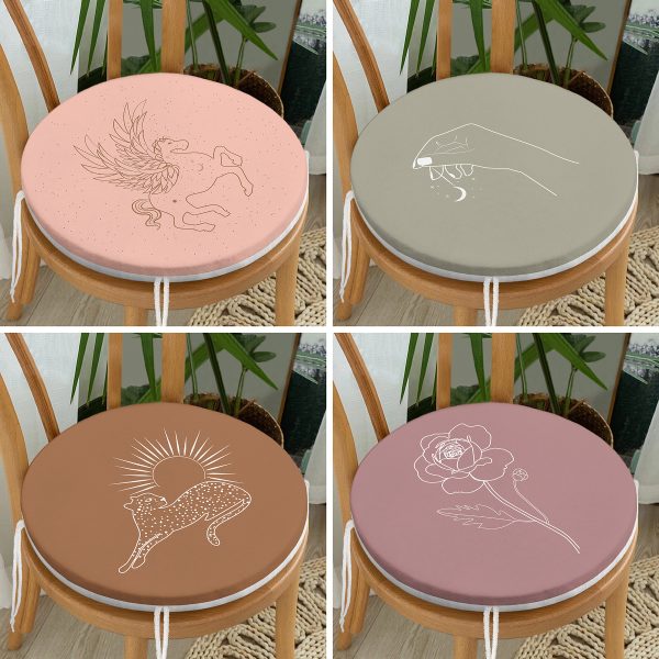 4’lü Renkli Zemin Üzerinde Onedraw Çizimli Modern Yuvarlak Fermuarlı Sandalye Minderi Seti