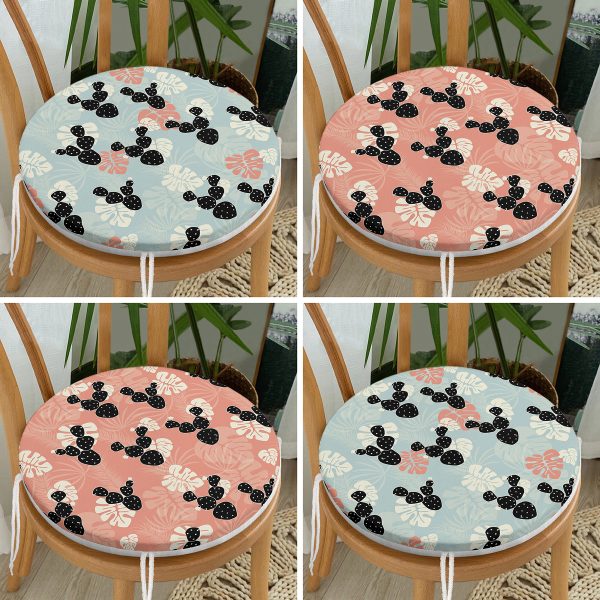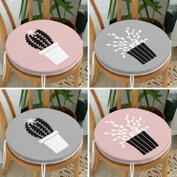 4’lü Gri & Pembe Zeminli Saksılı Kaktüs Tasarımlı Dijital Baskılı Modern Yuvarlak Fermuarlı Sandalye Minderi Seti