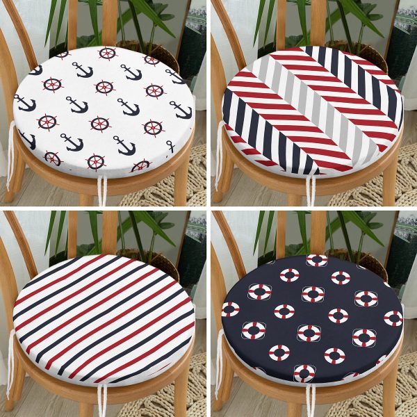 4’lü Renkli Zemin Üzerinde Gemici Desenli Modern Yuvarlak Fermuarlı Sandalye Minderi Seti