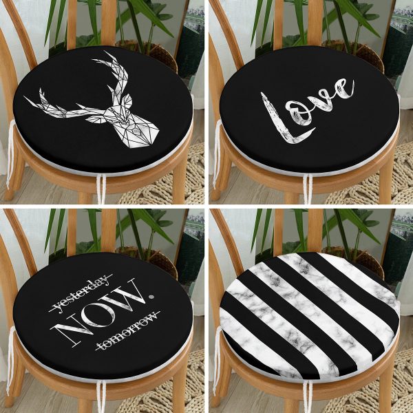 4’lü Beyaz Zemin Üzerinde Siyah Geometrik Desenli Modern Yuvarlak Fermuarlı Sandalye Minderi Seti