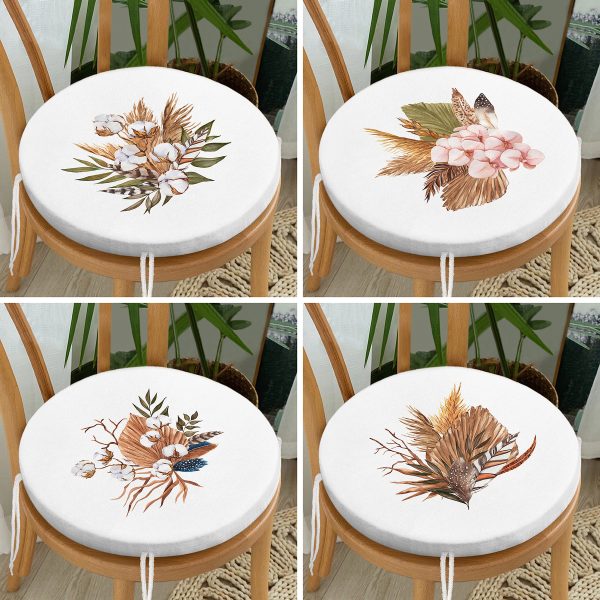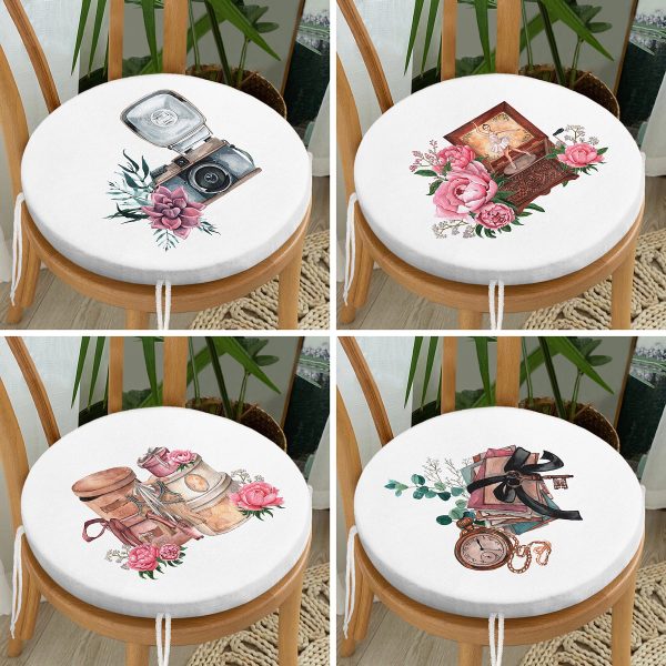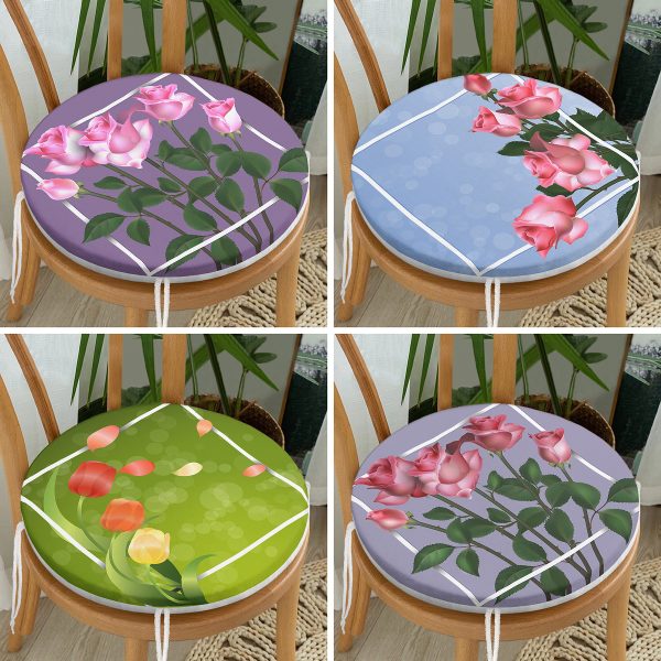 4’lü Renkli Zemin Gül Demetleri Özel Tasarım Dijital Baskılı Modern Yuvarlak Fermuarlı Sandalye Minderi Seti