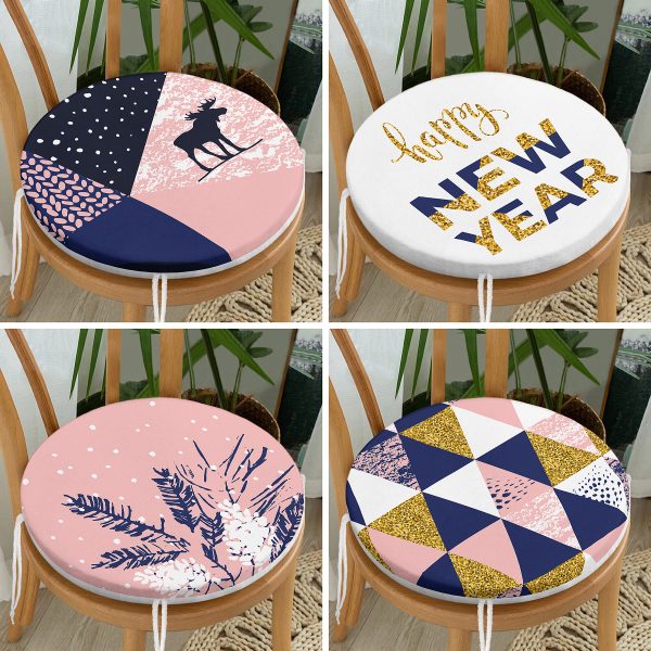 4’lü Happy New Year Temalı Dijital Baskılı Modern Yuvarlak Fermuarlı Sandalye Minderi Seti
