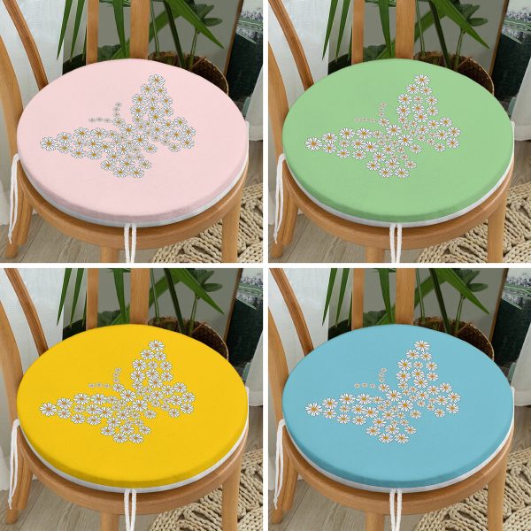4’lü Renkli Zemin Papatya Kelebek Özel Tasarımlı Dijital Baskılı Modern Yuvarlak Fermuarlı Sandalye Minderi Seti