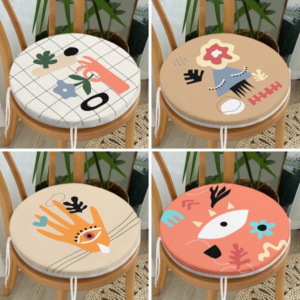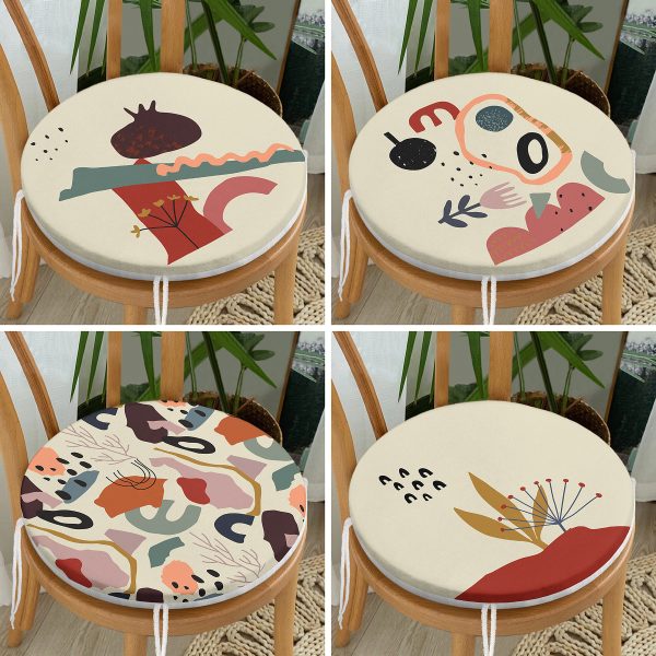 4’lü Renkli Zemin Üzerinde Soyut Desenli Modern Yuvarlak Fermuarlı Sandalye Minderi Seti