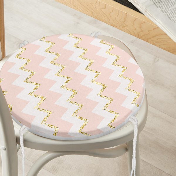 Pembe Zemin Üzerinde Gold Detaylı Renkli Zikzak Desenli Dijital Baskılı Modern Yuvarlak Fermuarlı Sandalye Minderi