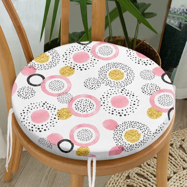 Beyaz Zeminde Gold Detaylı Renkli Puantiye Desenli Dijital Baskılı Modern Yuvarlak Fermuarlı Sandalye Minderi