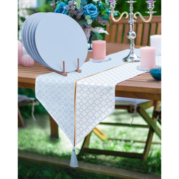 Realhomes Mavi & Beyaz Ogea Desenli Püsküllü Runner & 6’lı Mavi Düz Renk Supla – Servis Altlığı