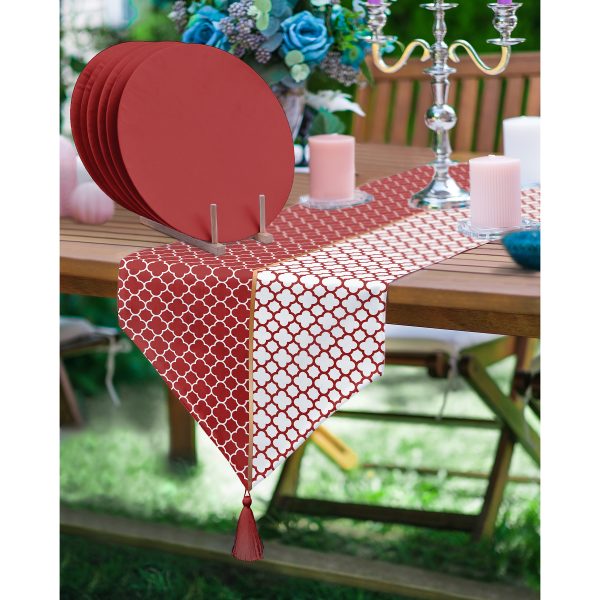 Realhomes Bordo & Beyaz Ogea Desenli Püsküllü Runner & 6’lı Bordo Düz Renk Supla – Servis Altlığı