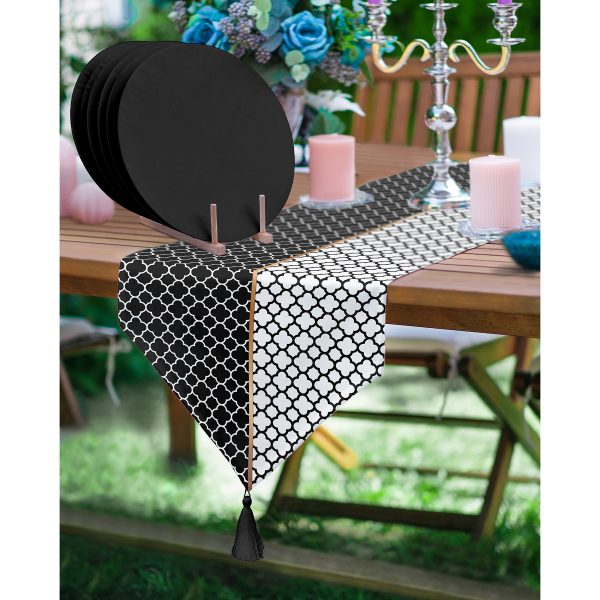 Realhomes Siyah & Beyaz Ogea Desenli Püsküllü Runner & 6’lı Siyah Düz Renk Supla – Servis Altlığı