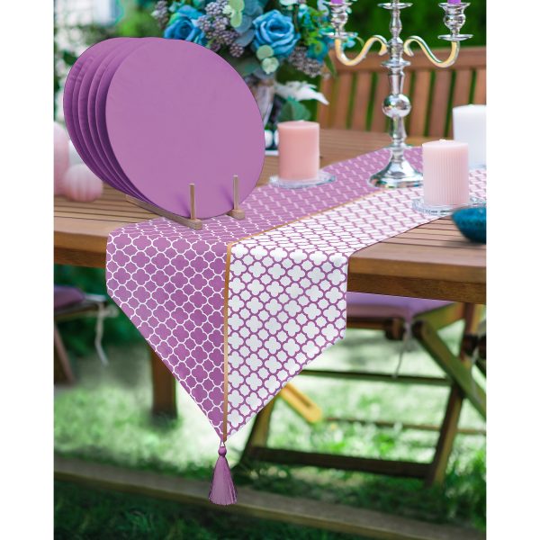 Realhomes Mor & Beyaz Ogea Desenli Püsküllü Runner & 6’lı Mor Düz Renk Supla – Servis Altlığı