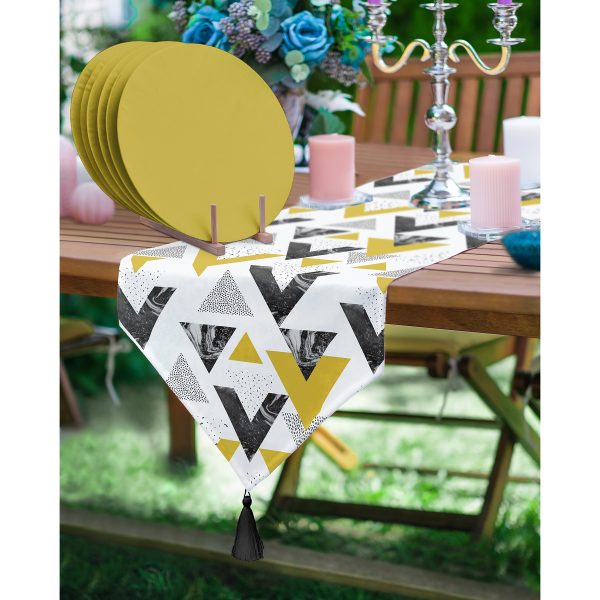 Realhomes Mermer Detaylı Siyah Beyaz Geometrik Motifli Püsküllü Runner & 6’lı Hardal Düz Renk Supla – Servis Altlığı