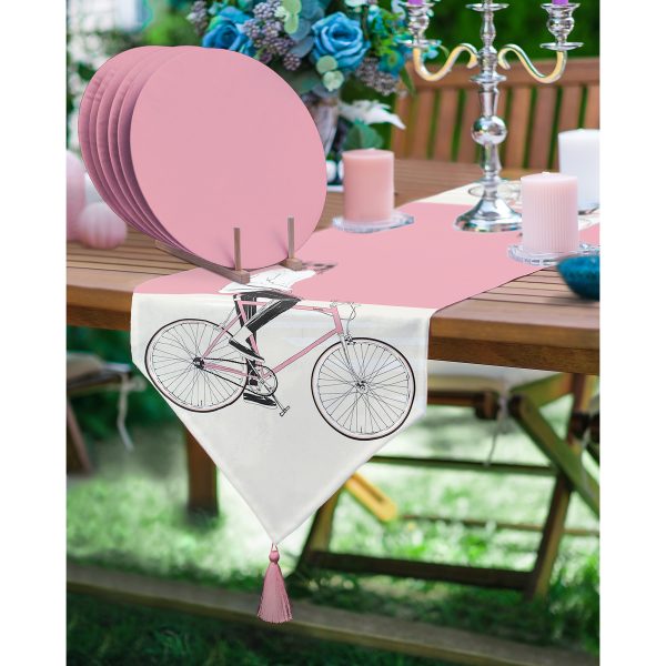 Realhomes Pembe Krem Zemin Bisikletli Adam Motifli Püsküllü Runner & 6’lı Pembe Düz Renk Supla – Servis Altlığı
