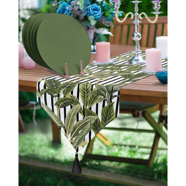 Realhomes Çizgili Zemin Tropik Yaprak Motifli Püsküllü Runner & 6’lı Yeşil Düz Renk Supla – Servis Altlığı