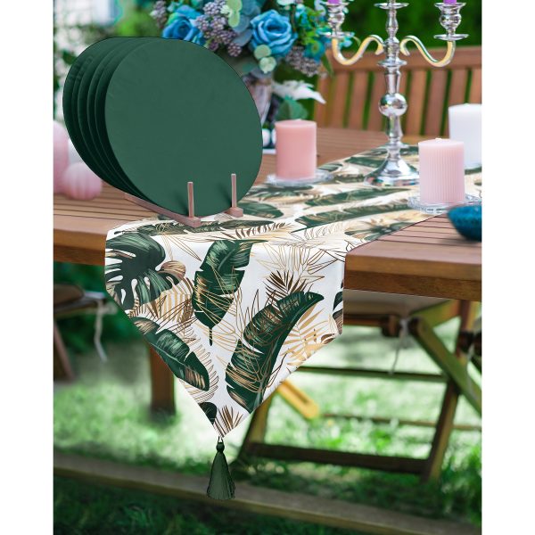 Realhomes Gold Detaylı Tropik Yaprak Tasarımlı Püsküllü Runner & 6’lı Yeşil Düz Renk Supla – Servis Altlığı