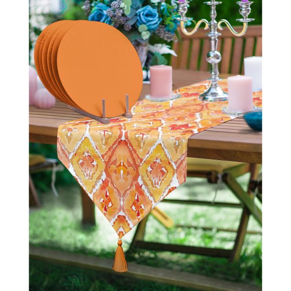 Realhomes Turuncu Damask Tasarımlı Püsküllü Runner & 6’lı Turuncu Düz Renk Supla – Servis Altlığı